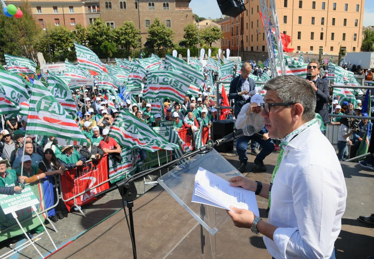 Si è svolta oggi a Roma la mobilitazione nazionale unitaria di Fai Cisl, Flai Cgil e Uila Uil. I sindacati dell’agroalimentare hanno portato, come promesso, 6000 lavoratori in Piazza Bocca della Verità, con un presidio inserito nel solco delle mobilitazioni unitarie promosse da Cgil, Cisl e Uil negli ultimi mesi, a partire dalla grande manifestazione del 9 febbraio. Ha partecipato all'iniziativa anche il Segretario generale aggiunto della Cisl Luigi Sbarra.